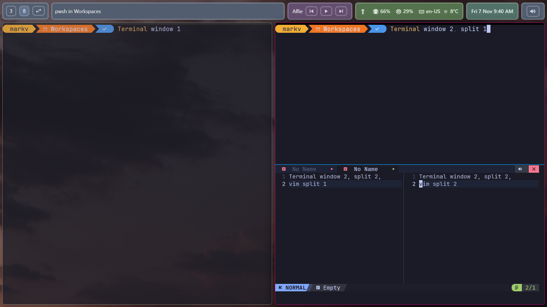 Alt+Entereither vertically or horizontally, and let GlazeWM tile them. These windows can be switched between and moved withShift+Alt+i/j/k/landAlt+i/j/k/l, respectively. - Split vim into multiple tabs, and move between them with